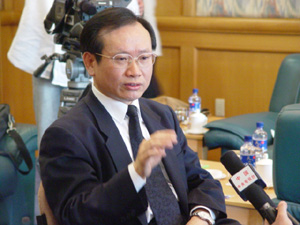 黃淑和在會(huì)議間歇接受中央電視臺(tái)等多家媒體采訪