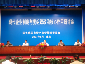 2007年5月17日至19日,國資委召開現代企業制度與黨組織政治核心作用研討會。國資委主任、黨委書記李榮融同志出席會議并作重要講話,國資委領導李偉、王勇、王瑞祥、黃淑和、黃丹華、賈福興、李壽生同志出席會議。部分中央企業董事長、黨委(黨組)書記、總經理,國資委有關廳局負責同志等80多人參加了研討會。