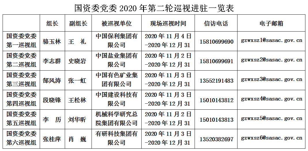 根據黨中央關于巡視工作的決策部署,按照國資委黨委工作安排,11月初,國資委黨委6個巡視組分別進駐中國保利集團有限公司、中國鹽業集團有限公司、中國有色礦業集團有限公司、中國建設科技有限公司、機械科學研究總院集團有限公司、有研科技集團有限公司等6家中央企業黨委開展常規巡視。