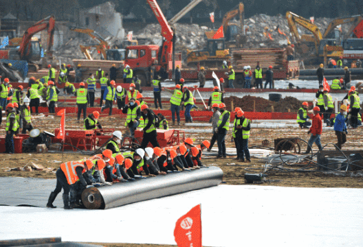 火神山醫院項目現場建設快速推進,現場有近700名管理人員、4000余名工人(兩班倒)、各類大型機械設備及運輸車輛等近千臺,24小時輪班作業投入醫院建設戰斗。