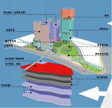 其中,貴醫再生水廠埋深31米,建筑面積1.56萬平方米,規劃建設日污水處理量為5萬噸/天,處于綜合體地下負4層和負5層;地上城市綜合體項目占地3.4萬平方米,建筑面積27萬平方米,包含醫療教育綜合體、品質住區、商業綜合體、鹽務文化公園等內容。