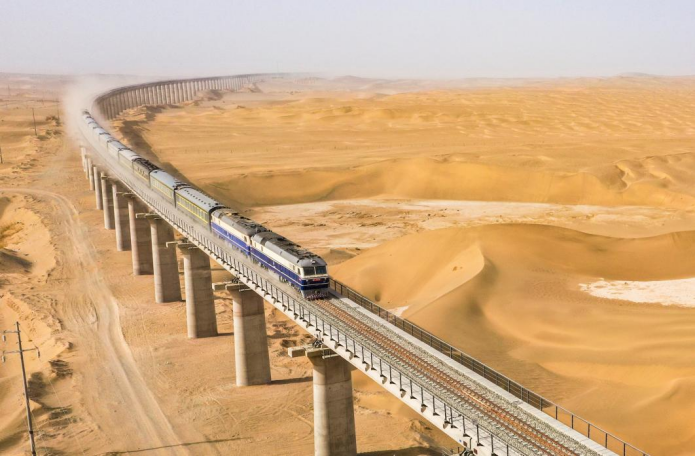 近日,中國證券報記者來到地處塔克拉瑪干沙漠邊緣的新疆和田,站在和田站的月臺上,恰逢一列從若羌駛來的列車徐徐進站。三年前,沙丘連綿的塔克拉瑪干沙漠還是一片人跡罕至的地方。如今,由中國鐵建參建的和若鐵路橫貫塔克拉瑪干沙漠南緣,為南疆大地注入蓬勃生機,讓塔里木盆地周邊五縣徹底告別不通火車的歷史,成為沿線經濟發展的新動脈。