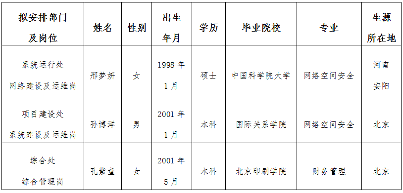 根據事業單位公開招聘人員有關規定,國資委信息中心先后完成公開報名、資格審核、考試、體檢、考察等程序,經研究,擬聘用以下2023年應屆高校畢業生為我中心工作人員,現予公示。