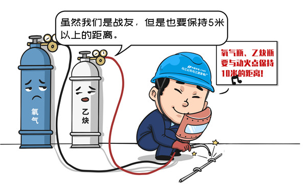 氧氣瓶、乙炔瓶要與動火點保持至少10米的距離,氧氣瓶與乙炔瓶的距離應保持8米以上。
