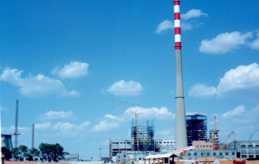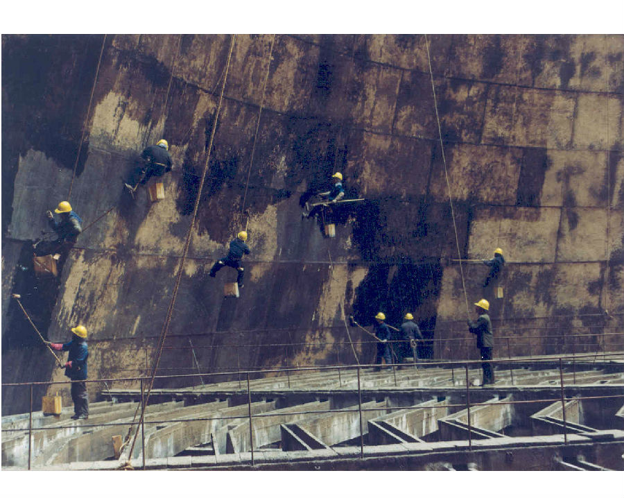 上世紀90年代初期萊蕪電廠工人正在進行冷卻塔內部防腐施工