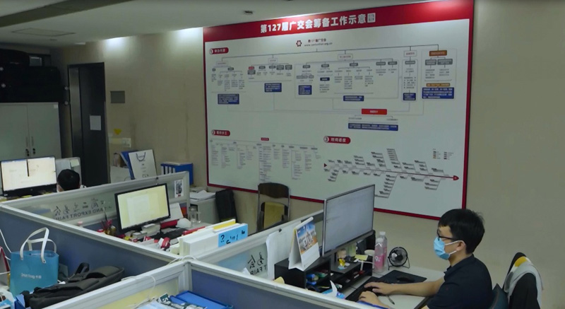 中國(guó)對(duì)外貿(mào)易中心辦公室的廣交會(huì)籌備工作示意圖(5月26日攝)。6月15日,第127屆廣交會(huì)正式拉開(kāi)帷幕。與歷屆相比,這是第一次完全以互聯(lián)網(wǎng)形式進(jìn)行的廣交會(huì),也是新冠肺炎疫情發(fā)生以來(lái)最大規(guī)模的全球性貿(mào)易盛會(huì)。