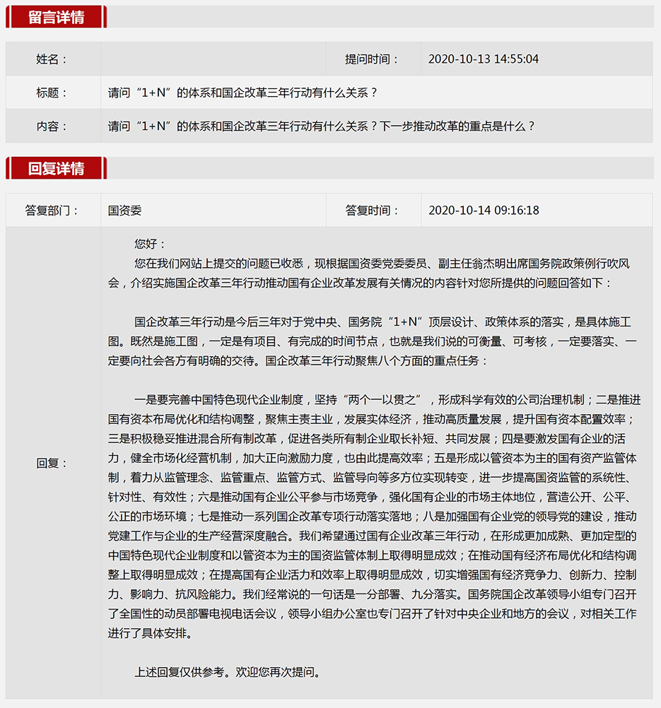 2020年10月國資委網(wǎng)站政務(wù)咨詢欄目部分網(wǎng)友提出的咨詢,我們初步做出了認(rèn)真的回應(yīng),現(xiàn)選擇五條關(guān)注度高、點(diǎn)擊量高的問題,再次推薦分享。