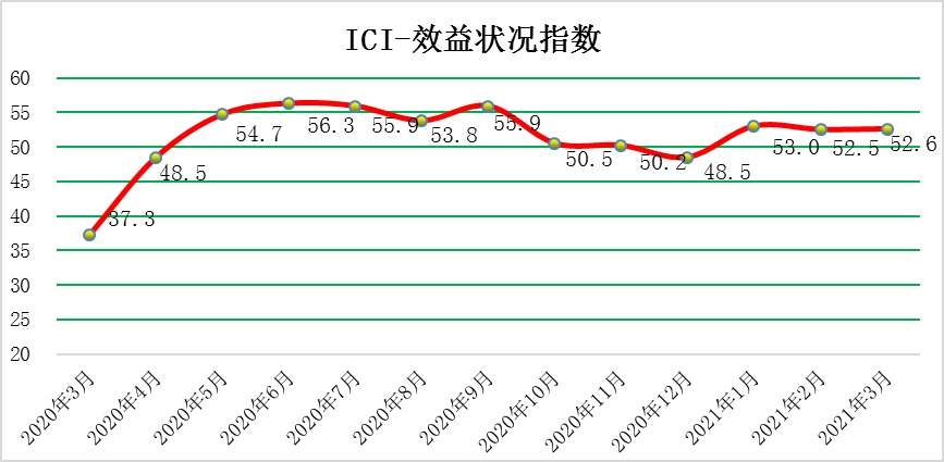 3月份,效益狀況指數(shù)為52.6 %,環(huán)比回升0.1個(gè)百分點(diǎn),繼續(xù)位于榮枯線之上,效益狀況持續(xù)恢復(fù)。具體來(lái)看,利潤(rùn)指數(shù)為59.5%,環(huán)比下降0.4個(gè)百分點(diǎn),企業(yè)盈利情況持續(xù)向好;成本指數(shù)為30.2%,環(huán)比上漲0.5個(gè)百分點(diǎn),企業(yè)在成本方面的負(fù)擔(dān)依舊嚴(yán)重,值得關(guān)注;產(chǎn)成品庫(kù)存指數(shù)為54.1%,環(huán)比下降1.6個(gè)百分點(diǎn),繼續(xù)位于榮枯線之上,需求大于生產(chǎn),產(chǎn)品庫(kù)存保持減少態(tài)勢(shì)。凈資產(chǎn)回報(bào)率指數(shù)為59.9%,環(huán)比上漲2.5個(gè)百分點(diǎn),繼續(xù)位于榮枯線之上,企業(yè)凈資產(chǎn)持續(xù)改善。