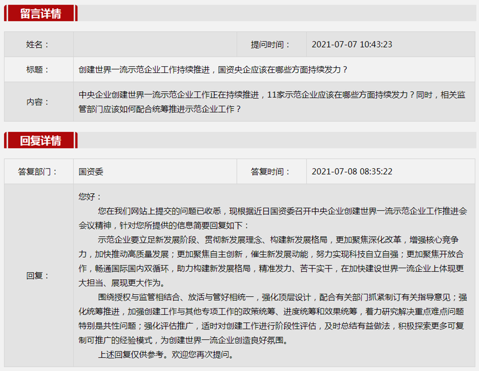 2021年7月國資委網(wǎng)站政務(wù)咨詢欄目部分網(wǎng)友提出的咨詢,我們初步做出了認(rèn)真的回應(yīng),現(xiàn)選擇五條關(guān)注度高、點(diǎn)擊量高的問題,再次推薦分享。