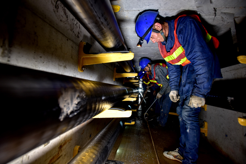 南方電網廣東珠海供電局工作人員在220千伏加珠線線路工程隧道內敷設電纜