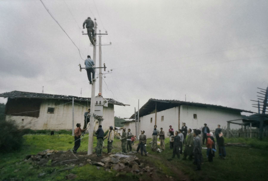 我記得電桿用的木料都是從山上用牦牛拉回來的。聽技術員說安裝好,就有電用,晚上也能跟白天一樣亮晃晃的,我們那個激動啊,沒日沒夜地挖洞、拉桿,用了六天時間就把變壓器架起來了。