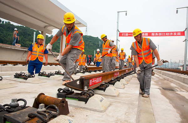 杭紹臺鐵路最后一對長鋼軌鋪設現場