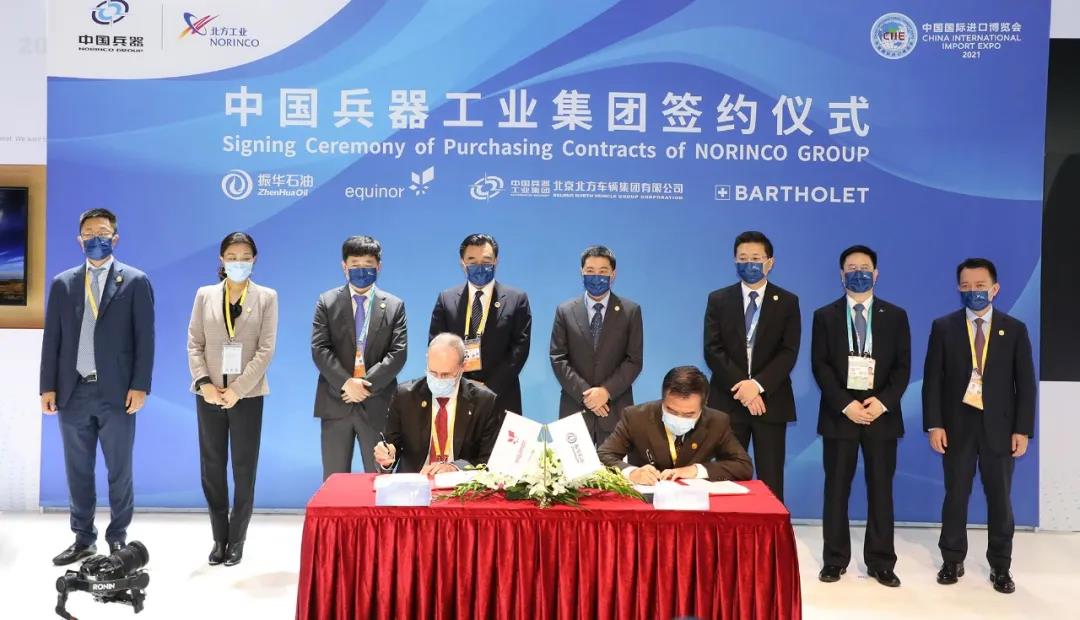 11月4日晚,第四屆中國國際進口博覽會在上海開幕。5日下午,兵器工業(yè)集團在展區(qū)現(xiàn)場開展進口簽約活動,北方公司振華石油控股有限公司與挪威國家石油公司簽署原油長期采購合作備忘錄,并圍繞碳減排技術(shù)及排放配額交易等議題展開交流,為履行2030年前實現(xiàn)“碳達峰”、2060年前力爭實現(xiàn)“碳中和”目標(biāo)貢獻力量。北京北方車輛集團有限公司與瑞士巴特萊集團簽署索道裝備采購合同,進一步拓展雙方長期友好合作的深度和廣度。