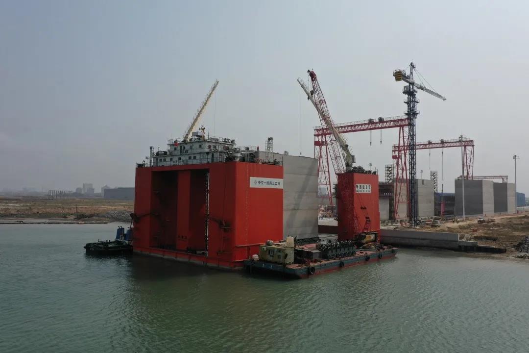 截至3月26日,工程已累計完成沉箱預制33段,碼頭基槽及港池疏浚400萬方,港池疏浚累計完成80%,碼頭基槽挖泥累計完成65%,沉箱預制累計完成22%。