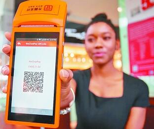 在加拿大多倫多約克戴爾購物中心,工作人員展示一名顧客所購商品的微信支付收款二維碼金額(加拿大元)。新華社發