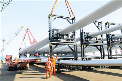2019年1月16日大批成套風電設備在江蘇省連云港港口集港準備出口澳大利亞。(人民視覺 王健民攝)