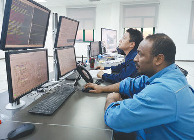 在米桑油田的中控室,中伊兩國值班人員正通過電腦屏幕控制油田設備。(曲翔宇攝)