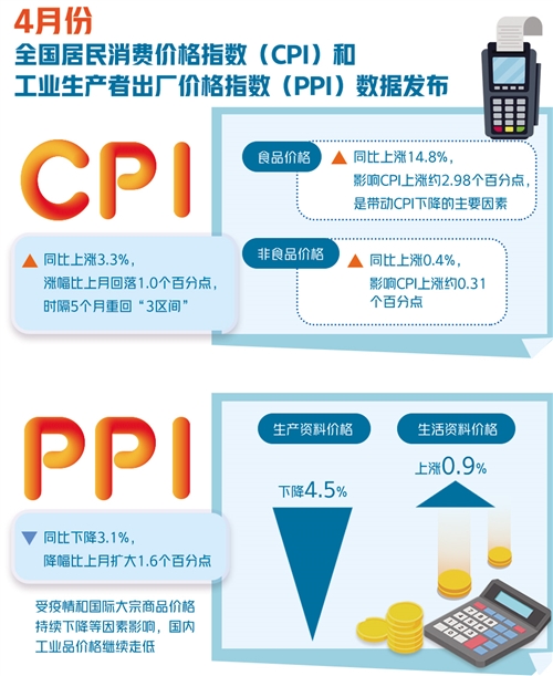5月12日,國家統(tǒng)計局發(fā)布了4月份全國居民消費價格指數(shù)(CPI)數(shù)據(jù)。4月份,CPI同比上漲3.3%,比上個月回落1.0個百分點,時隔5個月重回“3區(qū)間”;CPI環(huán)比下跌0.9%,跌幅比上月收窄0.3個百分點。