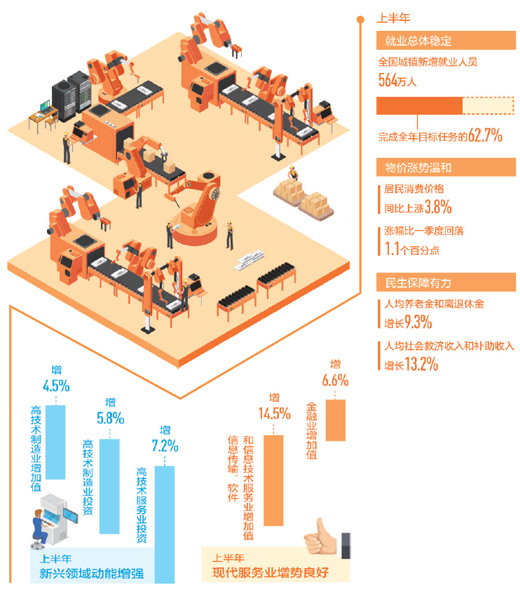 新經濟蓬勃發展,動能轉換態勢好。遠程辦公、在線教育、智能施工、無人配送等新模式有效化解了市場的堵點、難點;云計算、大數據、人工智能為代表的新技術快速發展;數字經濟、智能制造、生命健康等新產業形成了更多增長極……上半年,我國高技術制造業和高技術服務業投資分別增長5.8%和7.2%,其中電子商務服務業、科技成果轉化服務業投資分別增長32%、21.8%。新產業新業態新模式孕育壯大,將為經濟回升繼續提供有力支撐。