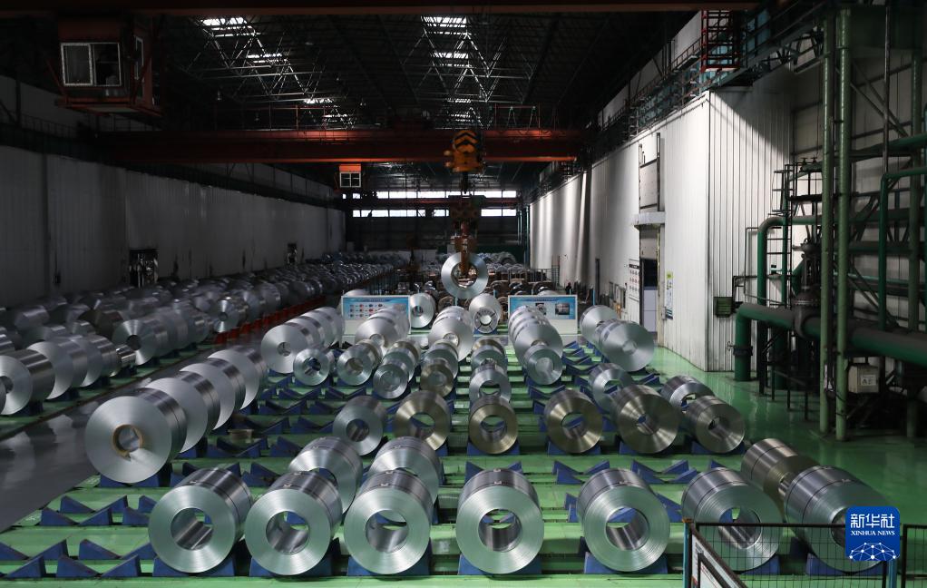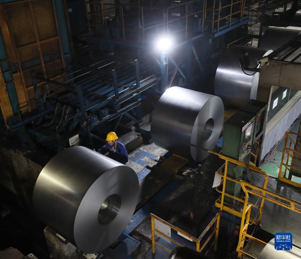 8月19日,在鞍鋼股份冷軋廠的鍍鋅線作業(yè)區(qū),吊車在搬運(yùn)鋼卷。新華社記者 楊青 攝