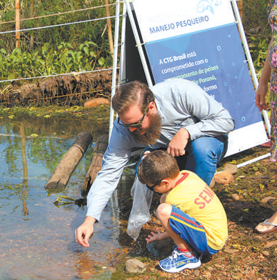 在位于巴西圣保羅州的伊利亞電站附近,三峽巴西員工帶領電站周邊社區孩子一起放流魚苗,并講解相關知識。三峽巴西供圖
