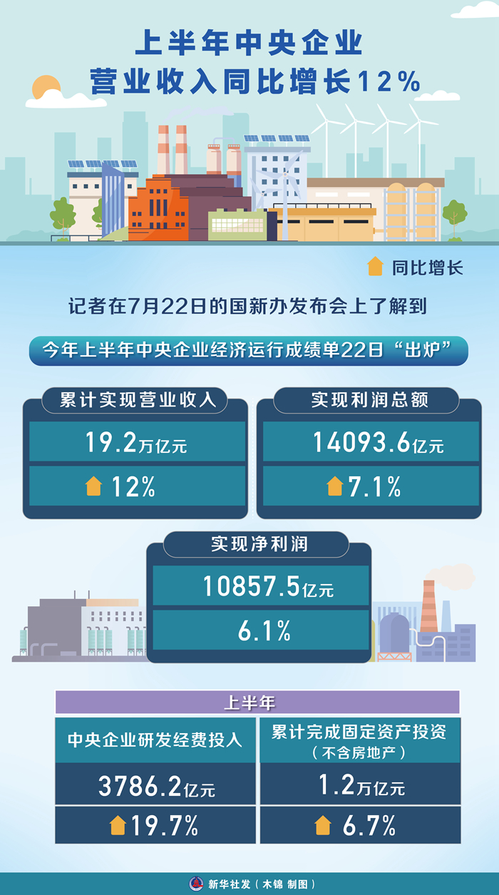新華社北京7月22日電 今年上半年中央企業經濟運行成績單22日“出爐”:累計實現營業收入19.2萬億元,同比增長12%;實現利潤總額14093.6億元,同比增長7.1%;實現凈利潤10857.5億元,同比增長6.1%。