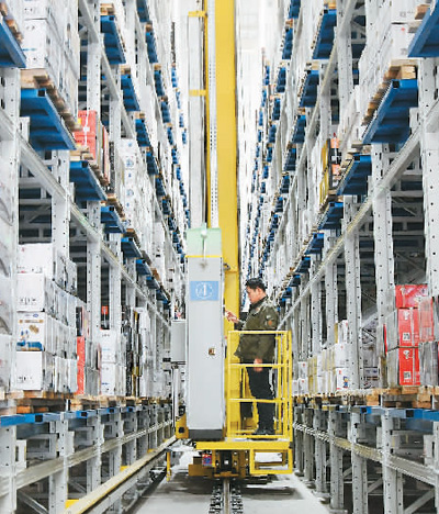 在河北省邯鄲市永年區的一家五金制造公司,工人正在智能倉儲車間裝卸貨物。