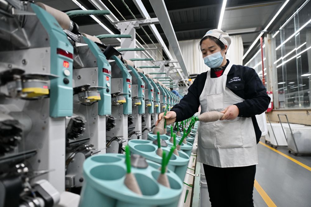 1月18日,河北省邢臺(tái)市清河縣一家羊絨制品生產(chǎn)企業(yè)的員工在羊絨紗線(xiàn)生產(chǎn)車(chē)間內(nèi)工作。