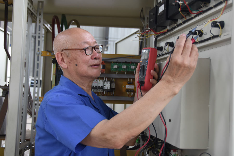 隨著太谷區疫情得以有效控制,利民公司各分廠開始陸續恢復生產,需在短時間內完成9件某重點產品的生產,但關鍵設備直焊機組、輥壓機組在搬遷后還未安裝就位,受疫情影響,廠外設備調試人員和生產線操作人員無法進廠,在廠的維修人員均未參與過該設備的安裝調試,致使相關工作無從下手,生產更是無法啟動。聽說這一消息后,曾參與過機組安裝的龐滂坐不住了,他不顧雙腿腫脹、身體不適,主動請纓加入到設備調試工作中,他的出現,給大家吃下了一顆“定心丸”。確定技術參數等相關數據,確保實測數據與圖紙數據的一致性,是設備調試的首要工作。直焊機組電器線路有200多條,好似一張密密麻麻的“蜘蛛網”,肉眼難以區分,一旦混淆,連接錯誤將直接影響調試進度。龐師傅蹲在機臺前,一根一根檢測,在控制柜、執行元件之間來回穿梭,確定每條線路的作用,對損壞線路進行更換,并對調試好的線路進行編號。八十多歲的龐師傅常常一蹲就是好幾個小時,一天下來腰都直不起來,本就腫脹的雙腿更是邁不開步,但他依舊堅守在調試現場,既當指揮員,又做戰斗員,全面摸排設備情況,制定調試方案,重新設計損壞部件。在他的指揮下,設備設施管理中心組織精兵強將對設備進行調試,機加分廠、農機配件分廠對零部件進行加工制作,物資供應中心抓緊采購缺件,各相關單位密切配合,各種零部件在最短時間內就位,保障了設備調試工作順利展開。