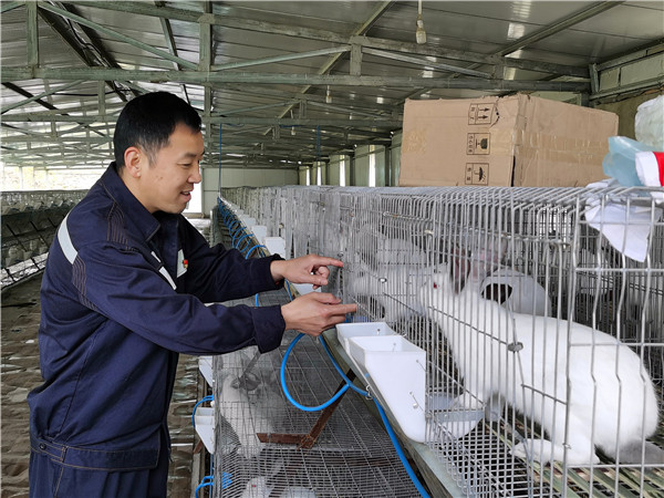 羅興國查看種兔的健康狀況,并仔細(xì)檢查每個兔籠的飲水設(shè)備是否良好。(譚鎮(zhèn)林 攝)