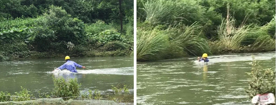 在團(tuán)河鎮(zhèn)官舟村,為搶修跨河光纜中間的故障點(diǎn),楊俊躍脫下鞋襪及長褲,在腰上綁上繩子,緩緩地走入河中。湍急而冰涼的河水逐漸沒過了楊師傅的脖子,他到達(dá)對岸后將重新敷設(shè)的光纜泅渡牽引過來,最終順利完成了搶修任務(wù)。