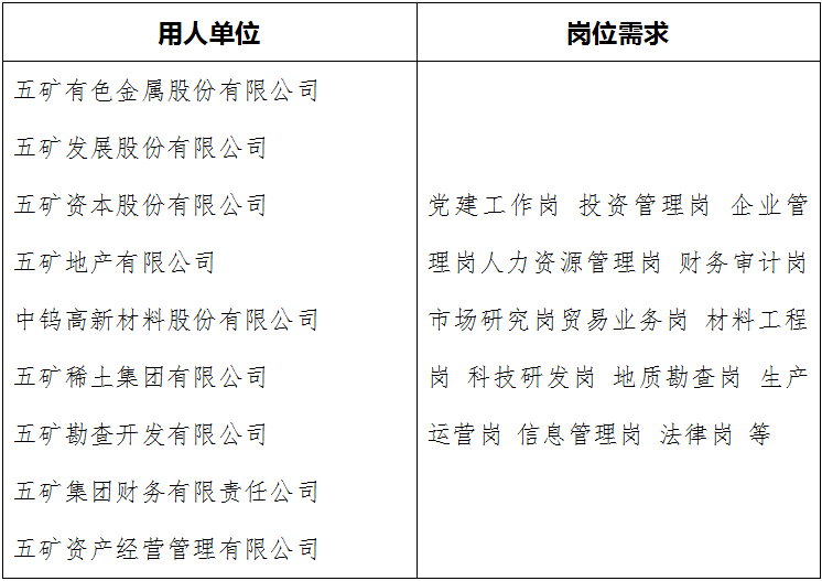 (更多職位信息見(jiàn)企業(yè)招聘官方網(wǎng)站:zhaopin.minmetals.com.cn)