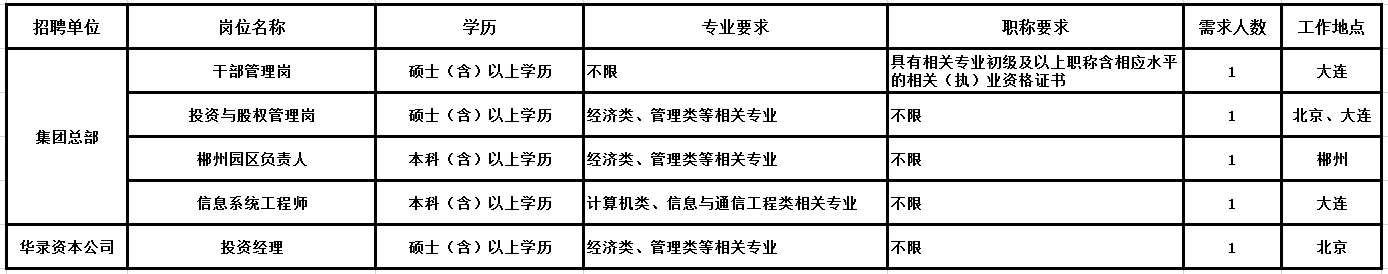 根據工作需要,中國華錄集團有限公司(以下簡稱“華錄集團”)總部及所屬1家子企業華錄資本控股有限公司(以下簡稱“華錄資本”面向社會公開招聘,現公告如下: