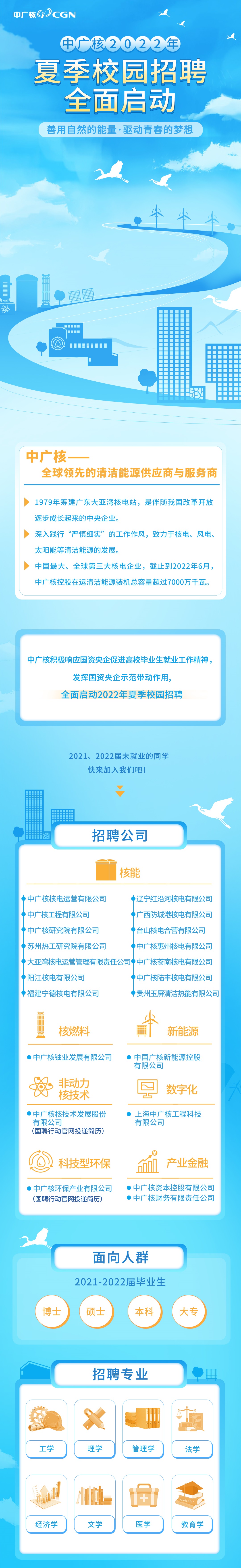 為深入貫徹習(xí)近平總書記關(guān)于做好高校畢業(yè)生就業(yè)工作的重要指示批示精神,堅決落實黨中央、國務(wù)院穩(wěn)就業(yè)保就業(yè)決策部署,充分發(fā)揮國資央企促就業(yè)示范帶動作用,中廣核作為全球領(lǐng)先的清潔能源供應(yīng)商與服務(wù)商,積極踐行央企擔(dān)當(dāng),全面啟動2022年夏季校園招聘,誠邀廣大高校畢業(yè)生,為助力實現(xiàn)“雙碳”目標(biāo)貢獻智慧,一起點亮綠色未來!