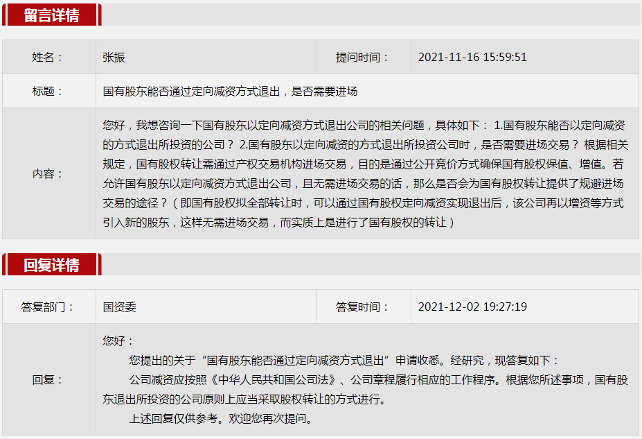 1.國有股東能否通過定向減資方式退出,是否需要進場
