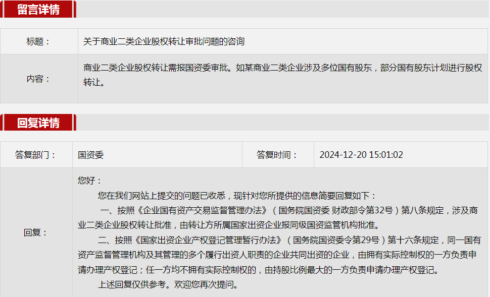 2024年12月國務院國資委網站政務咨詢欄目部分網友提出的咨詢,我們初步做出了認真的回應,現選擇五條關注度高、點擊量高的問題,再次推薦分享。