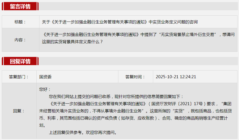 3.關于《關于進一步加強金融衍生業(yè)務管理有關事項的通知》中實貨業(yè)務定義問題的咨詢