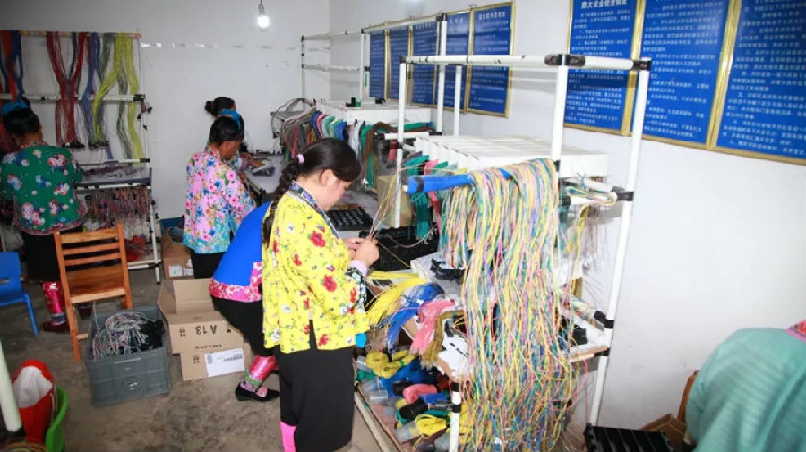 “扶貧車間”從2018年10月建成運作至今,已有近20名婦女參與,主要生產寶駿510車型的發動機線束組線,通過來料加工方式供應產品。車間產線不斷發展,目前汽車線束產量已實現超250套/天,每人新增收入1.2萬元/年,并按照月產量情況獲得產量獎勵。