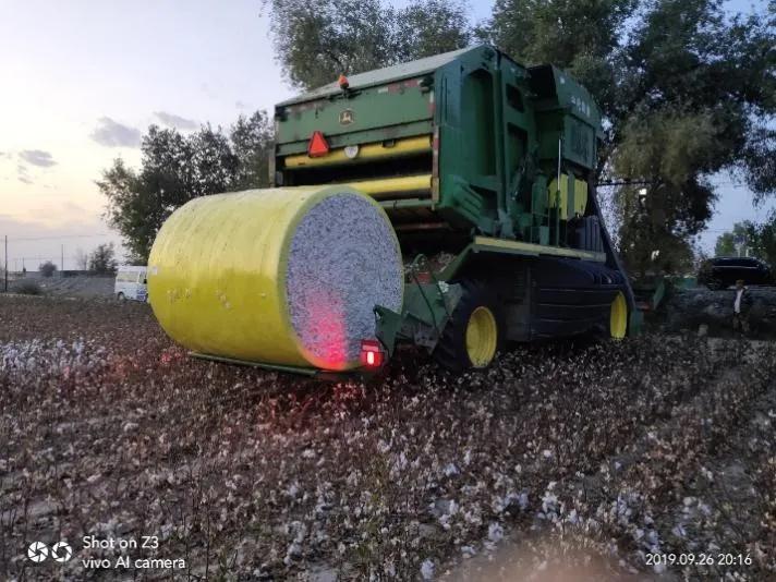 中化農(nóng)業(yè)整合全球先進(jìn)農(nóng)機(jī)資源,引進(jìn)世界領(lǐng)先的打包采棉機(jī)——約翰迪爾CP690,棉農(nóng)風(fēng)趣地稱之“下蛋機(jī)”。采棉快、自動(dòng)打捆,有效避免棉花中轉(zhuǎn)過程中被二次污染,大幅提升棉花品質(zhì)。一臺(tái)采棉機(jī)一天可采收400畝棉花,相當(dāng)于1600名采棉工的工作量,棉花采收費(fèi)用從人工每公斤2元降到機(jī)采每公斤0.5元。