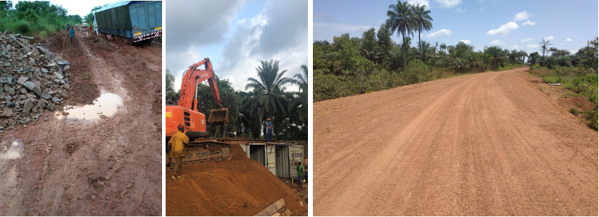 2019年10月初,幾內(nèi)亞的雨季即將過去,去年雨季后分公司為所在地修整過的Bulonge到Katiga道路又被今年的暴雨沖刷的坑坑洼洼。為避免影響周邊百姓的出行,保障過往車輛的安全,分公司項目組又派出推土機、壓路機、平地機、水車、自卸車等施工設(shè)備,在三名中方工長的帶領(lǐng)下,雇傭當(dāng)?shù)毓と?5人,歷時20天,將這條40公里長的土路上被損毀路段修整完畢,共計花費約15萬元。