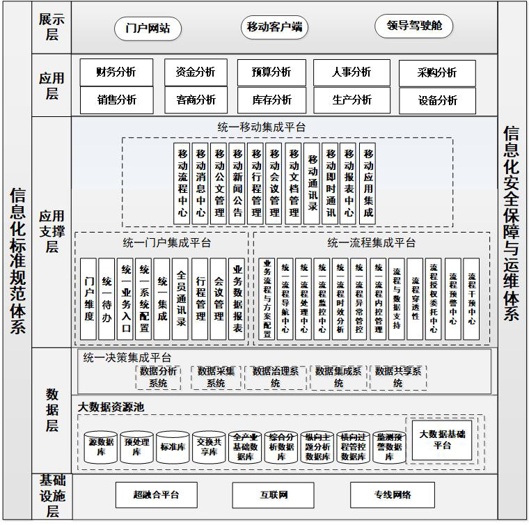 五是信息管理平臺化。整合資源建設(shè)具有數(shù)據(jù)中臺和業(yè)務(wù)中臺雙重屬性的云平臺,包括統(tǒng)一門戶集成平臺、統(tǒng)一流程管理平臺、統(tǒng)一決策支持平臺和統(tǒng)一移動應(yīng)用平臺,實現(xiàn)業(yè)務(wù)系統(tǒng)全面融合。