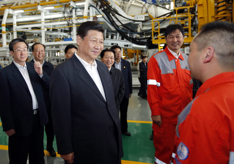 在中鐵工程裝備集團(tuán)有限公司盾構(gòu)總裝車間,習(xí)近平通過(guò)模型了解盾構(gòu)機(jī)整體構(gòu)造和工作原理,然后登上一座85米長(zhǎng)的盾構(gòu)機(jī)裝配平臺(tái),察看了裝配情況。他向現(xiàn)場(chǎng)科技人員和職工問(wèn)好,對(duì)他們攻克科研難題、突破盾構(gòu)機(jī)系統(tǒng)集成技術(shù)壁壘的自主創(chuàng)新給予肯定。習(xí)近平指出,裝備制造業(yè)是一個(gè)國(guó)家制造業(yè)的脊梁,目前我國(guó)裝備制造業(yè)還有許多短板,要加大投入、加強(qiáng)研發(fā)、加快發(fā)展,努力占領(lǐng)世界制高點(diǎn)、掌控技術(shù)話語(yǔ)權(quán),使我國(guó)成為現(xiàn)代裝備制造業(yè)大國(guó)。一個(gè)地方、一個(gè)企業(yè),要突破發(fā)展瓶頸、解決深層次矛盾和問(wèn)題,根本出路在于創(chuàng)新,關(guān)鍵要靠科技力量。要加快構(gòu)建以企業(yè)為主體、市場(chǎng)為導(dǎo)向、產(chǎn)學(xué)研相結(jié)合的技術(shù)創(chuàng)新體系,加強(qiáng)創(chuàng)新人才隊(duì)伍建設(shè),搭建創(chuàng)新服務(wù)平臺(tái),推動(dòng)科技和經(jīng)濟(jì)緊密結(jié)合,努力實(shí)現(xiàn)優(yōu)勢(shì)領(lǐng)域、共性技術(shù)、關(guān)鍵技術(shù)的重大突破,推動(dòng)中國(guó)制造向中國(guó)創(chuàng)造轉(zhuǎn)變、中國(guó)速度向中國(guó)質(zhì)量轉(zhuǎn)變、中國(guó)產(chǎn)品向中國(guó)品牌轉(zhuǎn)變。