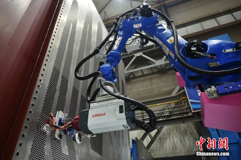 圖為車間里的焊接機器人正在進行“鐵臂繡花”。
