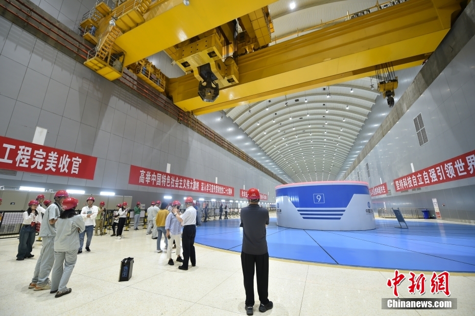 由于金沙江峽谷的特殊地形,白鶴灘水電站的廠房建在攔水壩兩側(cè)的山體中。白鶴灘水電站廠房也是世界最大的水電地下洞室群。圖為采訪團(tuán)走進(jìn)地下廠房,觀看發(fā)電機(jī)組。
