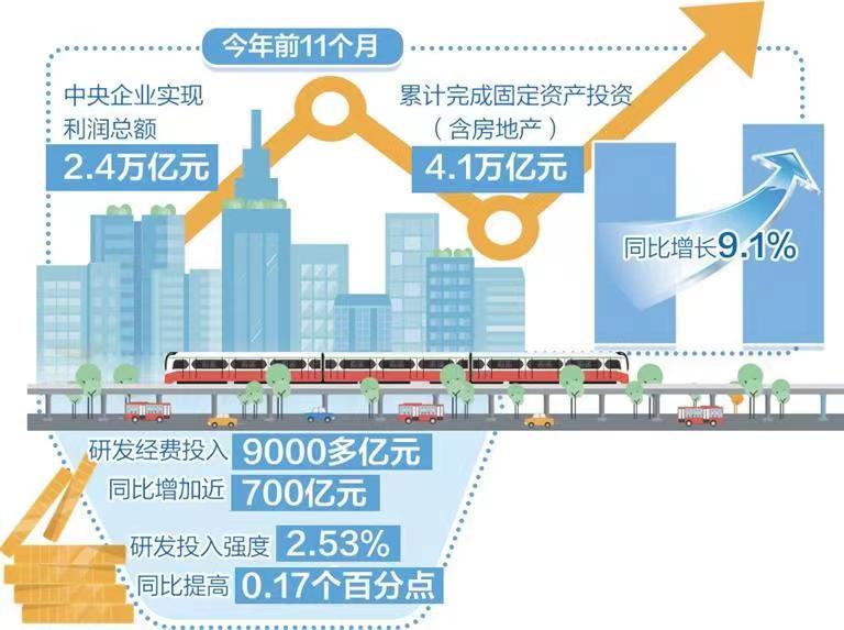 今年央企克難奮進,經營效益保持穩定,有效投資大幅增長,運行效率持續改善。前11個月,中央企業實現利潤總額2.4萬億元,累計完成固定資產投資(含房地產)4.1萬億元、同比增長9.1%,年化全員勞動生產率77.3萬元/人、同比增長3.8%。