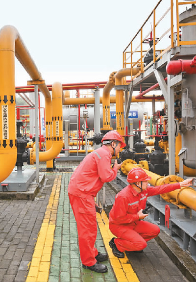 在位于重慶涪陵的中國首個投入商業(yè)開發(fā)頁巖氣田——涪陵頁巖氣田白濤集輸站,技術(shù)人員對設(shè)備進(jìn)行巡檢。