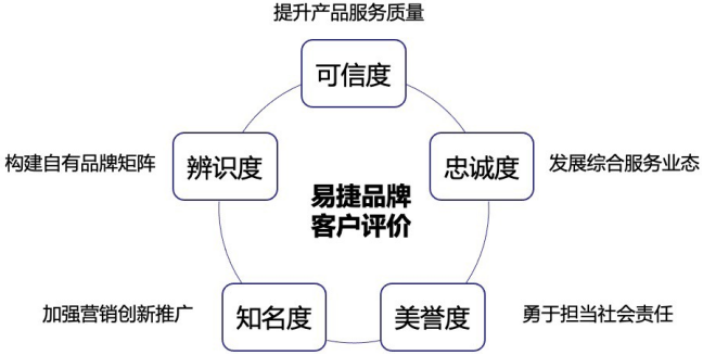 “易捷”根據零售業和服務業的行業特點,進一步把“客戶評價”細分為“可信度、辨識度、忠誠度、知名度、美譽度”五個維度,確定了“五位一體”全面推進的品牌建設路徑。