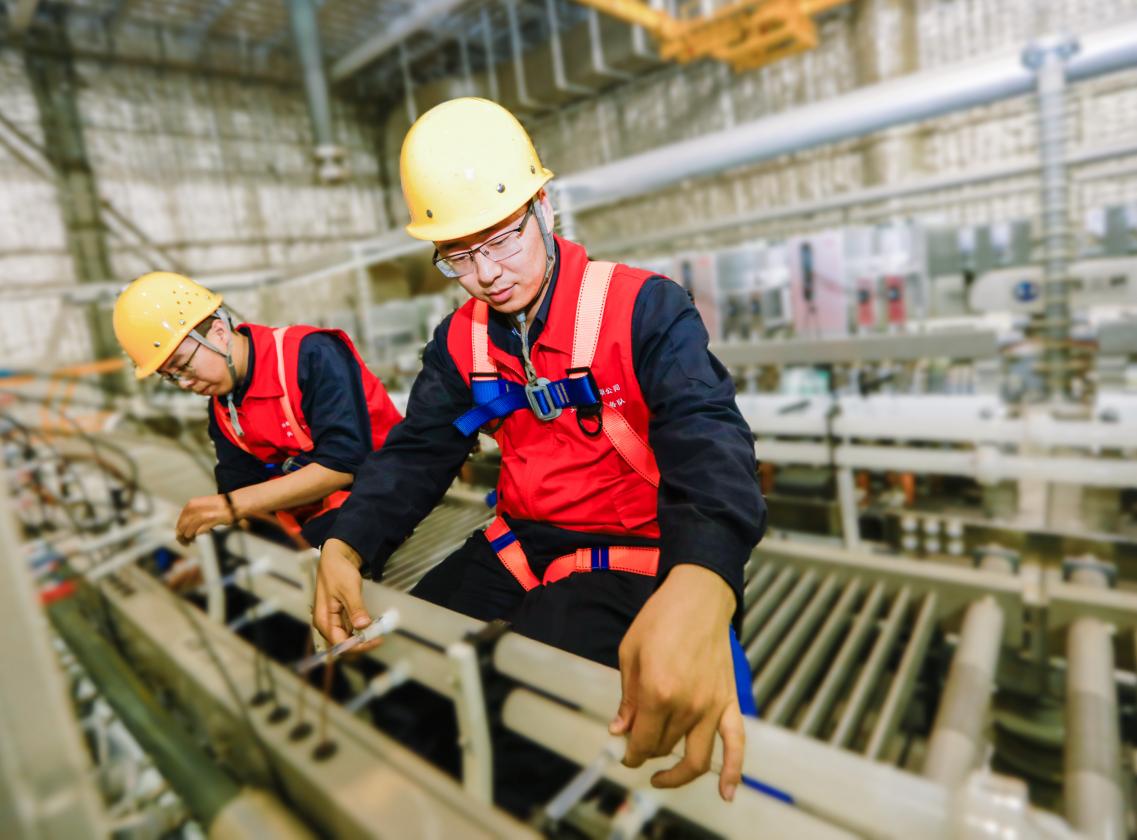 天山北麓的風裹挾著雪粒,呼嘯著掠過換流站的鐵灰色外墻。換流閥閥廳內,暖黃色的燈光下,王曉民正半跪在閥塔上,一寸一寸進行閥組件及零部件的檢測校核。他的指尖被凍得發紅,鼻尖卻沁出一層細密的汗珠。