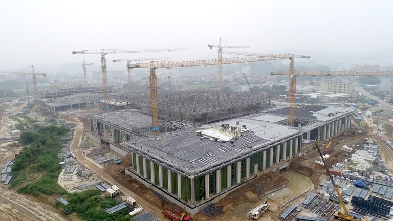 要打造這樣獨特造型的建筑,必須要創(chuàng)新技術。項目經(jīng)過討論研究后決定采用液壓同步整體提升的技術,“這就好比用一個巨人之手,把已經(jīng)在地面組裝好的連廊直接提升到高空。”項目經(jīng)理朱早孫解釋這項新技術。不同于過去小體量的低空提升,這次體量和高度都超乎尋常,為了確保萬無一失,項目引入BIM技術,通過電腦模擬了整套施工流程,確保提升精準度。雖然今天BIM技術已經(jīng)推廣普及,而在2013年,用BIM還是新鮮的探索。在深圳人看來,創(chuàng)新已是一種習慣,不只是理念、技術和實際行動,更是一種文化新生態(tài),融入到深圳人的血液和骨子里,這對生在深圳、長在深圳的小伙兒黃嘉民來說也不例外。剛剛畢業(yè)一年的他是坪山會展中心的一名技術員,他所在的項目是中建二局在坪山區(qū)的一次創(chuàng)新嘗試。作為該區(qū)首個 EPC裝配式項目正在創(chuàng)造新時代的“深圳速度”——占地8.7萬平方米的會展中心建設工期僅8個月,比同類項目工期快了3倍!
