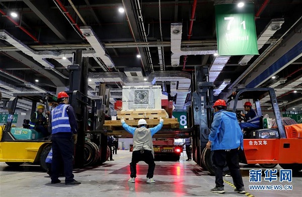 工人們在國家會展中心(上海)7號館內將從集裝箱中拆出的“金牛座”龍門銑床的零部件進行組裝